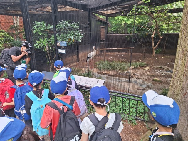 トイレ休憩を終え出発。まずは「神田川」源流。井の頭恩賜公園の池から神田川が始まります。公園内を歩いて池を渡り、鳥のゾーンへ。コウノトリやカモ、タンチョウなど、子どもたちは興奮気味。動物園に向かいます。
