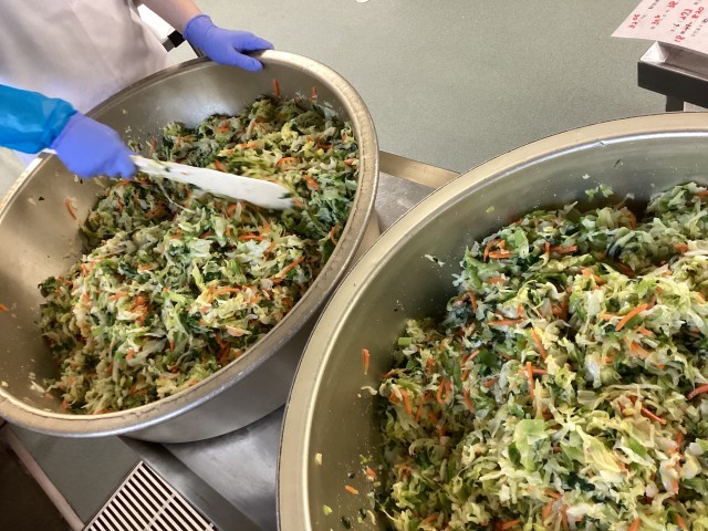 今日は春キャベツをたっぷり使ったサラダです。多聞小の全員、820人分で34kgのキャベツを