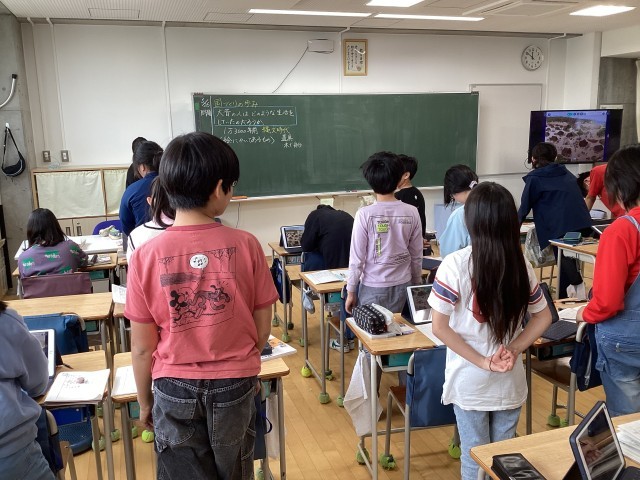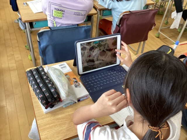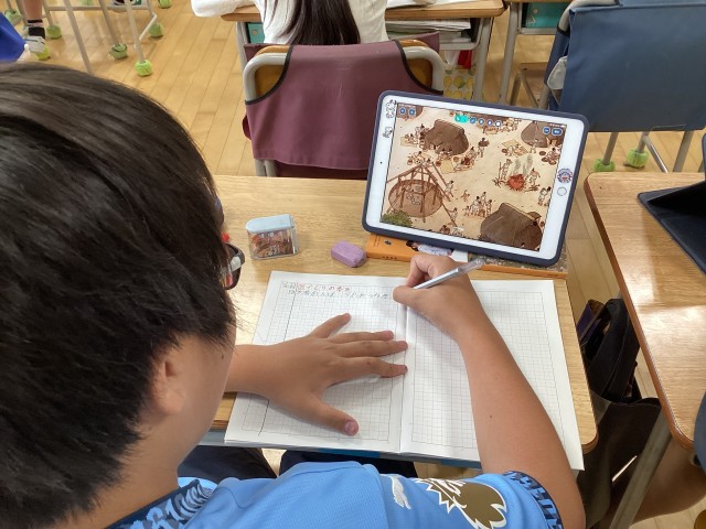 6年生の社会で歴史の学習が始まりました。今日は、縄文時代。子供たちはタブレットに送られてきた縄文時代の人々の生活の様子の絵を全体を見たり、拡大して細部をよく見たりしてさまざまなことを発見していました。地面に穴を掘ってその上に木で柱を立てて家づくりをしている様子や人々がどんなものをどのようにして食べているのか、弓や矢などの道具を作っている人がいるなどたくさんのことをこの絵から読み取っていました。