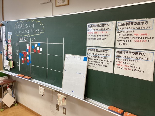 これまでは、課題に対して全員が同じことを調べていく場面が多く見られました。この授業では、課題に対して同じことを調べることに加えて、新潟の米作りが盛んな理由について各自が予想をし、その予想に基づいて自分なりの見通しをもって学習を進めていきます。「耕地整理をし、用水の整備をしたことで、水が得やすくなるとともに機械化が進んだのでは」「品種改良によって収量が上がったのではないか」「農業を共同で行うことでメリットがあるのではないか」など各自が個々の課題を解決していきます。「新潟ではなぜ米づくりが盛んなのか」という最終的な課題は共通ですが、それぞれ違うアプローチをし、個々が学習したことを学び合いで共有するという形で課題を解決していきます。子供たちにとっては、まずは自分で設定した課題を探究していくことになるため、意欲が持続しやすく人任せにせず、学びが主体的なものになります。一見バラバラに学習しているようで、一つの課題解決に向けて協働的に学習を進めているのです。
