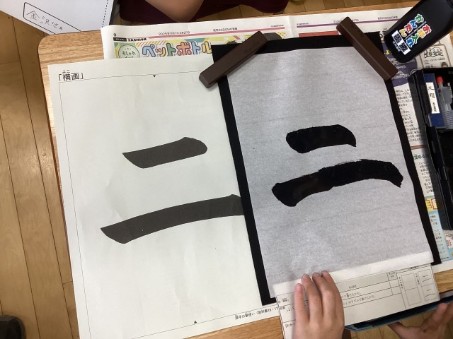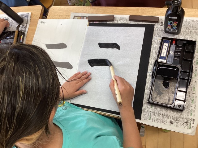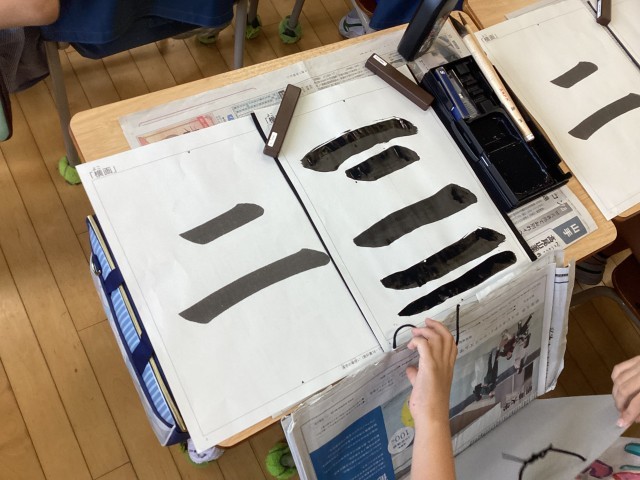 大切なのは、筆の運びです。入るところ、途中、終わりのところ。筆の先の向きや、どれくらい力を入れるのかなど、横に1本線を引くだけなのに、悪戦苦闘。さらに、半紙のどのあたりの位置から始まってどの位置で終わるのか。それぞれの画の長さや位置関係・・・と子供たちは真剣そのもの。