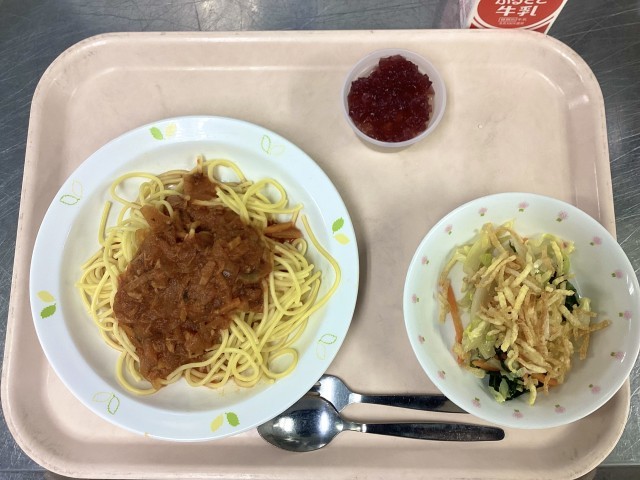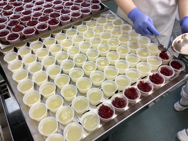 今日は、梅雨の時期に咲く「あじさい」に見立てたゼリーを作りました。りんごゼリーの上に、クラッシュしたぶどうゼリーをのせています。季節を感じながら食べてください。