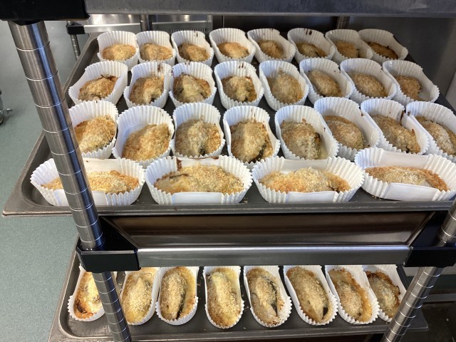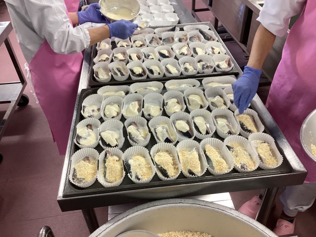 あじは今の時期に旬を迎える魚で、「あじ」という名前は「味が美味しい」ことから来ているといわれています。今日は、にんにくとマヨネーズを混ぜたソースをあじにかけた後、パン粉を振って焼きました。