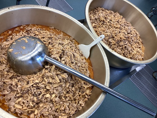 今日は、韓国料理のビビンバを作りました。野菜のナムルや肉、卵をごはんにのせ、よくかき混ぜて食べる料理です。給食では、ナムルと甘辛く味付けした肉を炒り卵の混ざったごはんの上にかけて食べます。スプーンでごはんと具を上手に混ぜ合わせながら食べましょう。