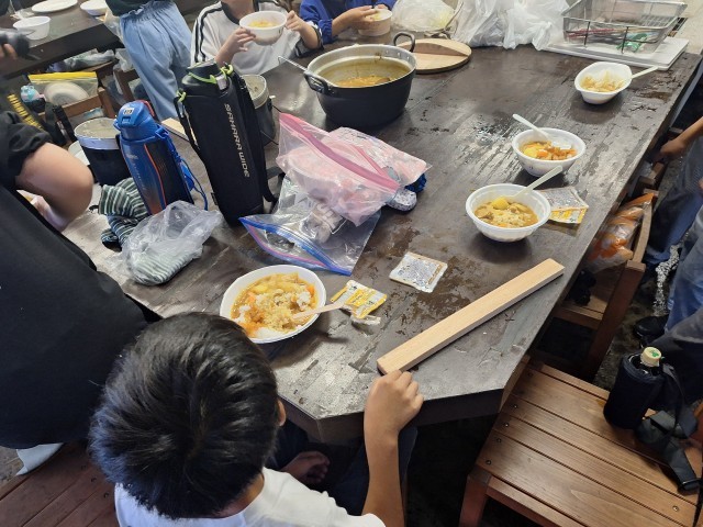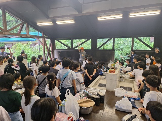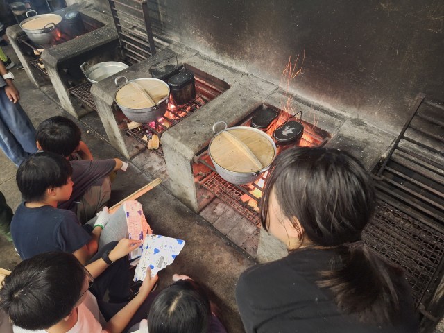 まずは、作業工程の説明を聞きます。そのあと、材料を切る担当、火を起こす担当に分かれ作業。なかなか火力が上がらず苦労して完成したグループも。