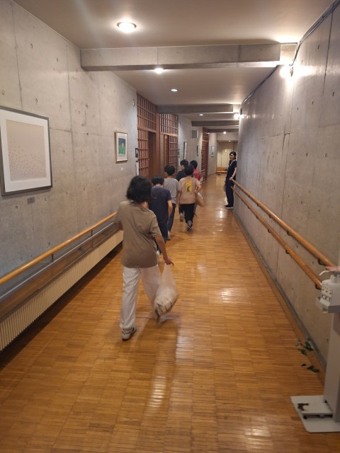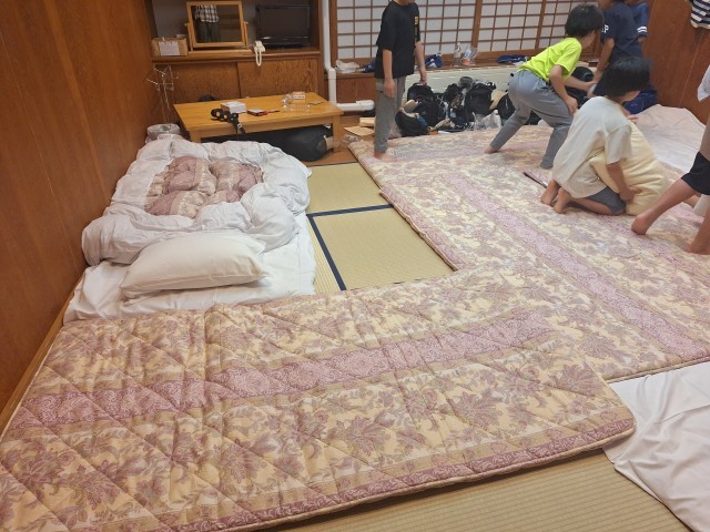 レクが終わり、就寝の準備。順番に入浴をします。また、寝具の準備も進めます。布団のレイアウトを工夫しないと人数分の布団を敷くことがてきません。検温をして健康状態を確認。班長会議で明日の予定を確認して班員に伝えます。今日は、雨の影響はありましたが、概ね予定をこなすことがてきました。