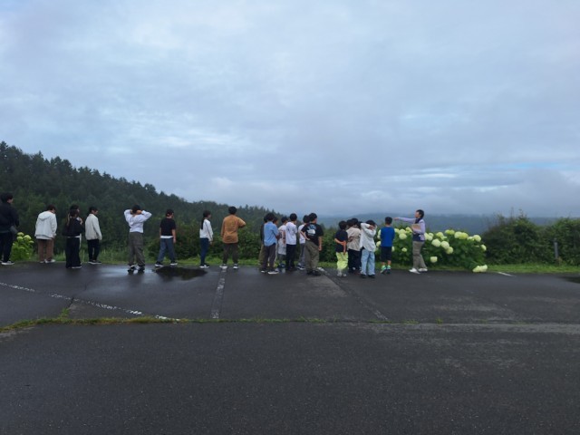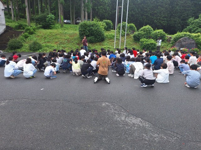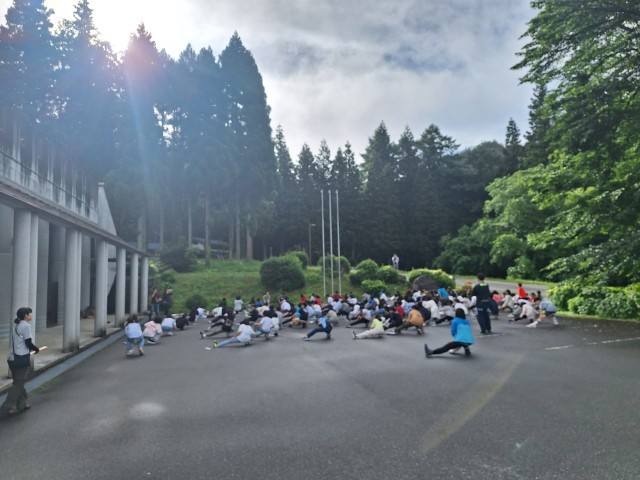 朝会です。朝のあいさつを元気にし、体操をしてまだ起ききっていない体を起こしました。戻る途中、川場村の風景を楽しみました。