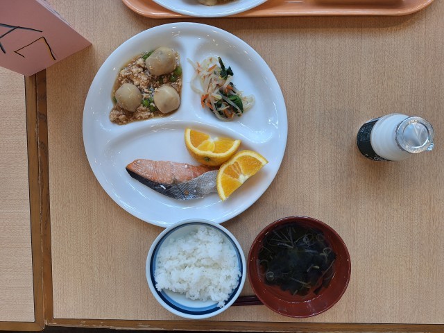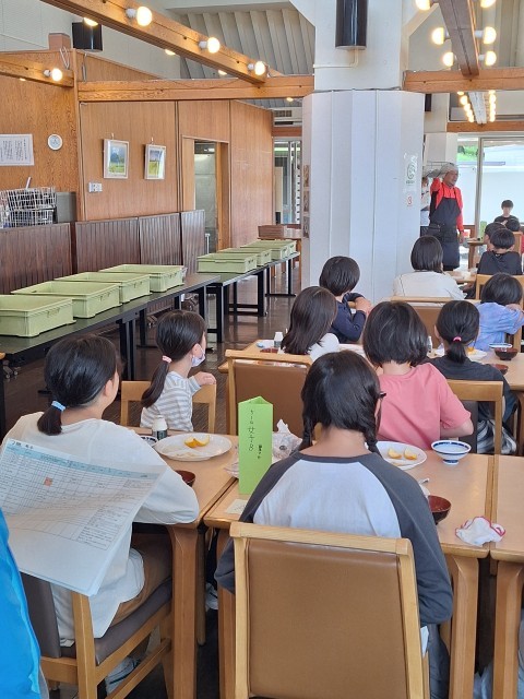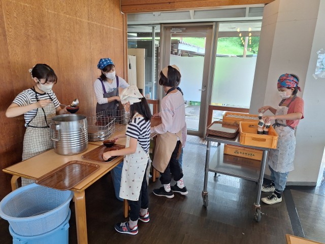 朝会のあとは、朝食です。食事係が朝会のあと配膳の準備を始めます。そのあと各班ごとに食堂に。おいしくいただきました。そして後片づけ。協力してできました。
