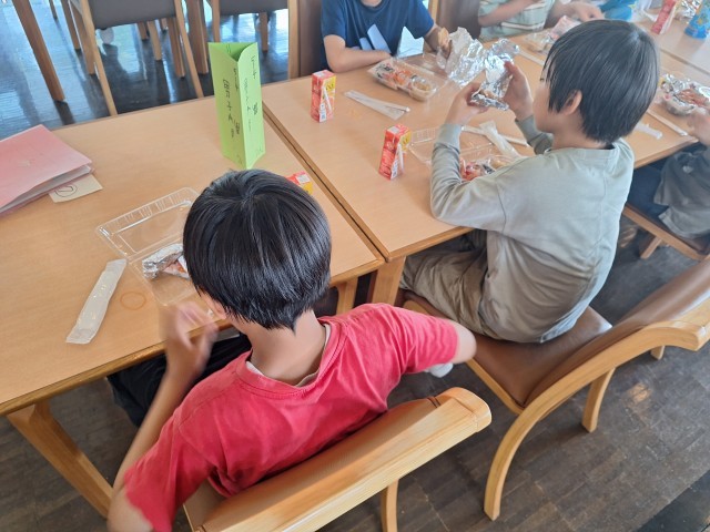 昼食は、おにぎりと魚のフライ他。食べ終わったあとに先ほどつかみどりしたマスの塩焼きが届きました。自分たちで捕まえたマスの塩焼きは格別でした。