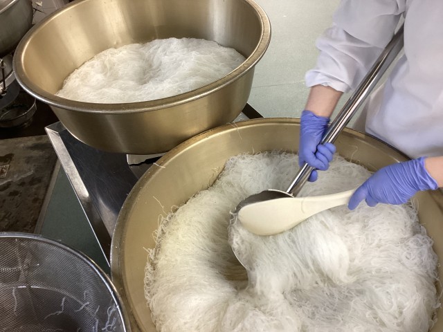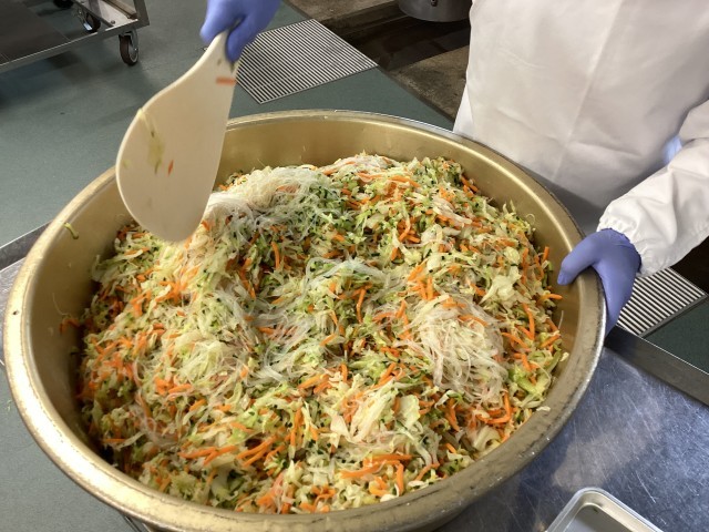 春雨は、緑豆という豆やじゃがいもから作られます。緑豆やじゃがいもから「でんぷん」を取り出し、そのでんぷんに熱湯を加えてよく混ぜた生地を小さい穴に通して、ゆでて麺の形にします。この時の様子が春に降る雨のように見えたことから「春雨」という名前が付いたといわれています。今日は、春雨と野菜、ハムを合わせてサラダにしました。