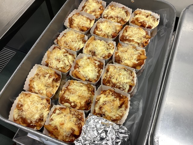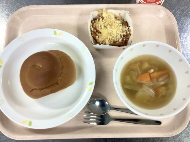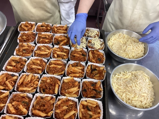 今日はなすのグラタンを作りました。ひき肉や玉ねぎをじっくり炒めてミートソースを作り、炒めたなすとペンネを合わせてグラタン皿に入れ、パン粉とチーズをかけて焼きました。なすは、つるつるとした濃い紫色の皮が特徴です。アントシアニンという色素が含まれており、目の健康に良い働きをします。ミートソースの味付けで、なすもしっかり食べてもらえると嬉しいです。