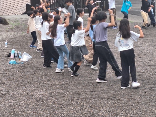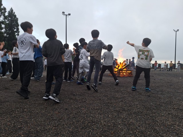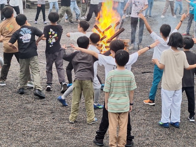 午後降っていた雨もあがり、今日は、急遽キャンプファイヤーを行いました。昨日は屋内のため火は使えなかったので、実際に点火してのキャンプファイヤーに子供たちもテンションUP!火の熱を感じながら、楽しそうに踊っていました。短い時間でしたが、よい時間を過ごせました。