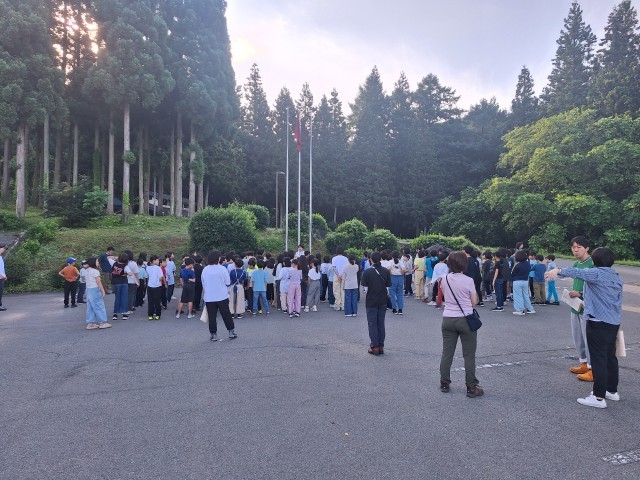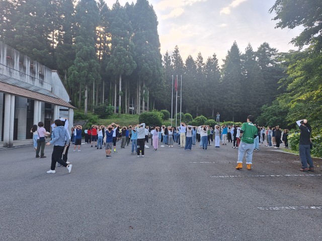 空は青空、爽やかな朝です。最終日の朝、子供たちはいい顔をして集まってきました。子供たちの集合も素早く静かになっています。今朝も朝会をし、このあとは、朝食です。