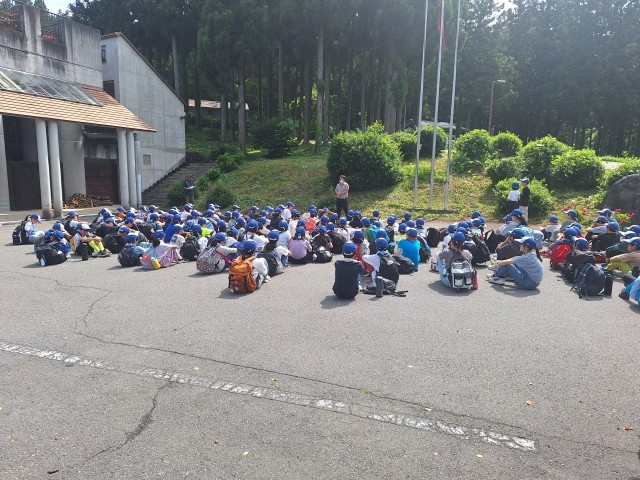 部屋の片付け、荷物整理をし、いよいよ閉室式です。このあとは、川場村の村めぐり。自分たちが住んでいる世田谷区と川場村の様子の違いを感じながら歩きます。途中、宮田りんご園に寄り、田園プラザをめざします。暑さに気をつけながら出発です。