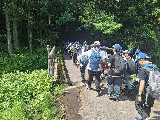 なかのビレジを出て、森を抜け、田んぼを見ながら宮田りんご園に到着しました。りんご農家をはじめ川場村の生活について話をしていただきました。子供たちは、とても一生懸命聞いていました。これからりんごジュースをいただきます。