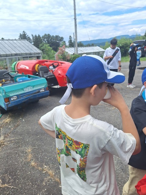 りんご園で本当の100%りんごジュースをいただきました。子供たちは「美味しい!」と大絶賛。