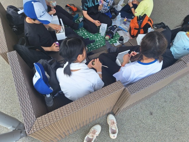 りんご園の方にお礼をしたあと、田園風景の中を歩き、田園プラザに到着。届いたお弁当を美味しいくいただきました。このあとは、学校に向けて出発します。