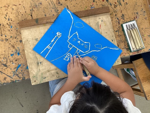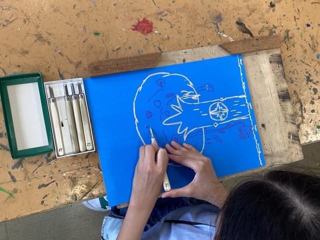 今回の作品作りの課題がまさにそこ。彫り進める線によって彫刻刀を使い分けていきます。まだ慣れない彫刻刀。安全に気をつけつつ、出来上がりをイメージして作品を仕上げていきましょう。