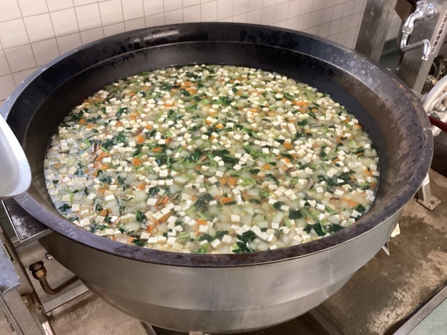 今日のスープには、「冬瓜」が入っています。冬瓜は夏に収穫される野菜で、きゅうりやスイカと同じウリ科の野菜です。冬瓜はかたい皮に守られており、切らずに丸ごと保存すると冬まで持つため「冬」という漢字が入っています。水分が多く含まれており、あっさりとした味が特徴です。