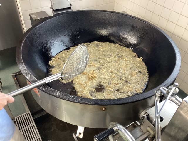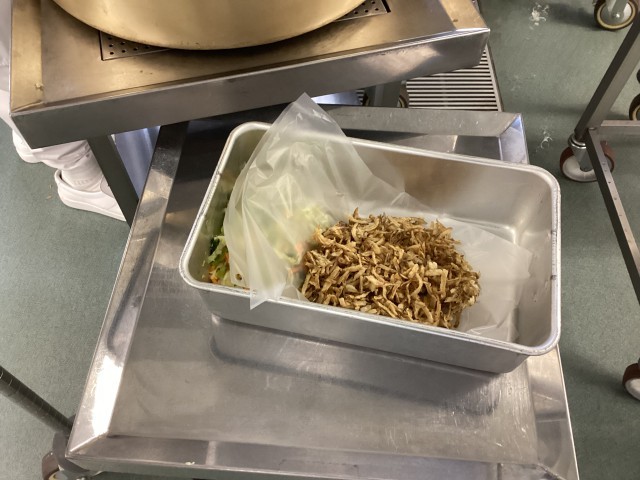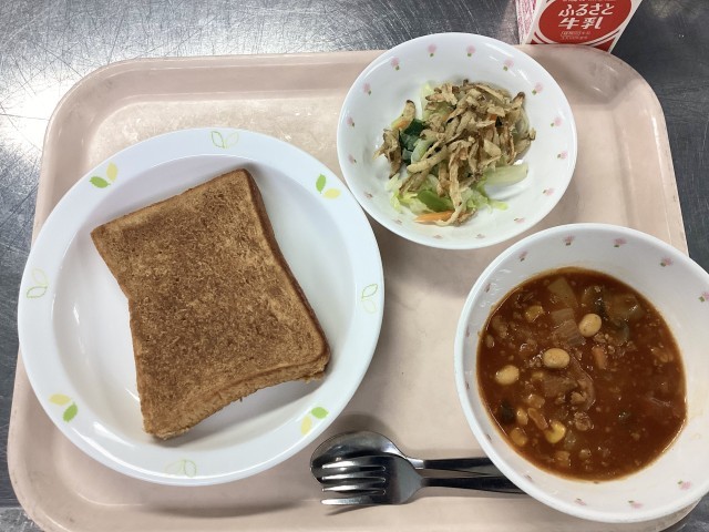 今日のサラダはごぼうチップをトッピングしています。ごぼうはかみごたえのある野菜で、おなかのそうじをしてくれる食物せんいがたくさん含まれています。今日は油で揚げているので、サクサクとした食感を味わいながら野菜と一緒においしく食べてください。