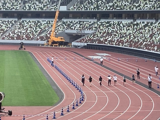 「コクリツ」に行ってきました その3 公開日 2025/07/09 更新日 2025/07/09 校長室より 遠くから見ると、走っている子供たちが小さく見えてしまうスケール感。・・・よく見ると、1人先生が混じって走っています。わかるかな?そのあとは、観客席に座って国立競技場の説明を聞きました。その後、よくサッカー選手が子供たちと出てくる口からロッカールームに向かいました。入り口から入った広間には、東京オリンピック・パラリンピックで使用した聖火リレーの本物のトーチと表彰台がありました。 いいね(3)