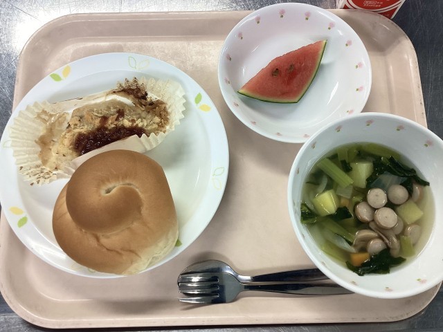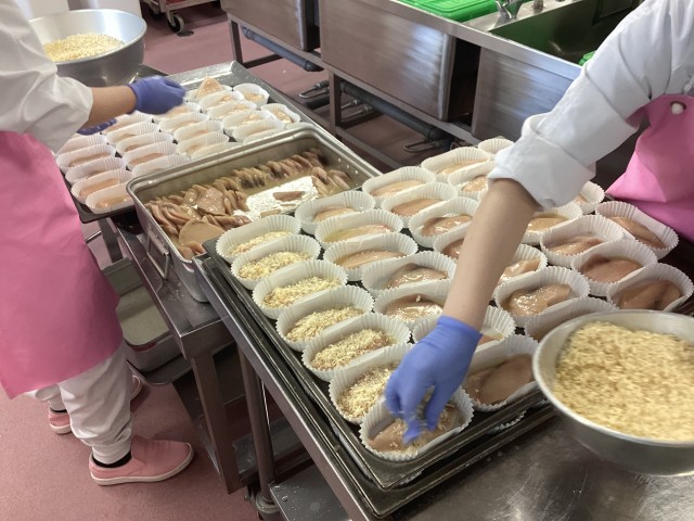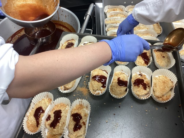 めかじきは、まぐろと同じ回遊魚で、時速100キロメートル以上の高速で泳ぎます。味にくせが無く柔らかい食感が特徴です。今日はめかじきにマスタードの入った調味料とオリーブオイルをからめて、パン粉をふって焼きました。仕上げにケチャップとソースで作ったタレをかけています。