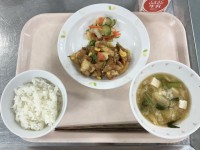 【今日の給食】麻婆豆腐丼牛乳中華スープみかん麻婆豆腐丼はたくさんの豆腐を使います...