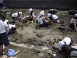 体操服に着替え、裸足になって、砂場での造形活動を行いました。 始めは「冷たい!」...