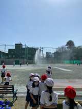一年生の校庭での体育授業中、砂嵐がすさまじく、先生がスプリンクラーを作動させまし...