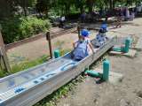 長い滑り台とクレーターで、遊んでいる様子です。滑り台の上からは、にぎやかな声が聞...