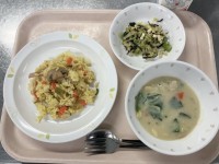 【今日の給食】洋風炊き込みごはん牛乳白菜のソイクリームスープ鉄骨サラダ今日の鉄骨...