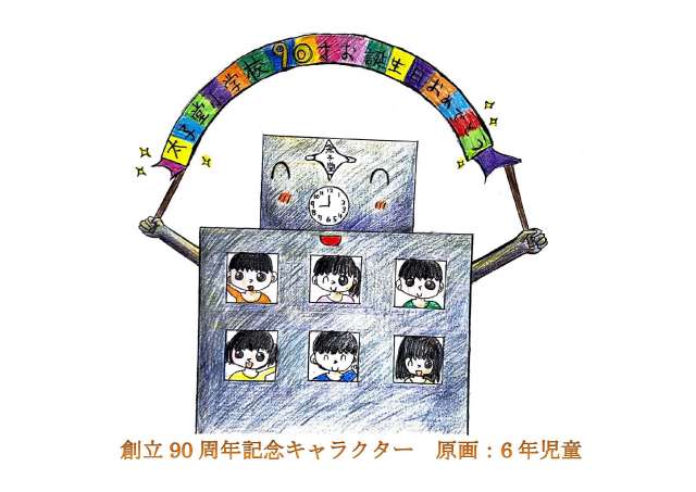 2017年度の代表委員会が「創立90周年記念キャラクター」を募集して、厳正に選出された10点の作品による投票を行い、創立90周年記念キャラクターが決定しました。擬人化された新校舎と楽しく学校生活を送る児童が一体化しているのが特徴です。デザインを考えた児童の思いを活かすため、手描きの感じを大切にしました。