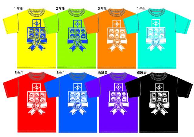 創立90周年記念Tシャツは、各学年児童と教職員の色を別々にして7色とし、全校で並ぶと虹色になるように工夫しました。