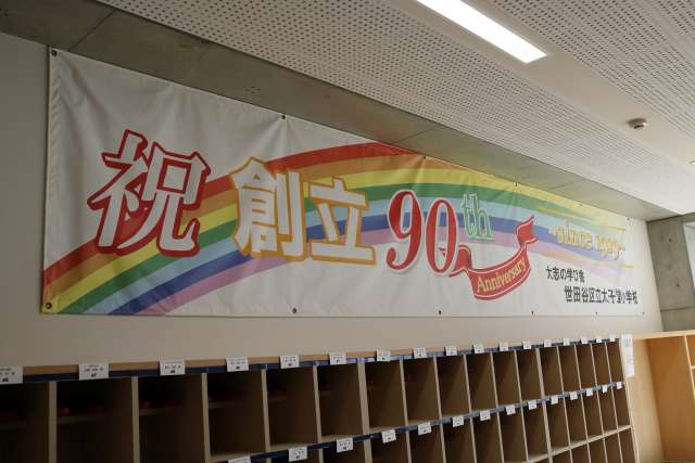 創立90周年記念横断幕は、90周年を迎える喜びとともに、未来へ向かって歩むことをイメージして虹が画面右上に向かって拡がっていくようにデザインしています。100周年へ向けて太子堂小学校がさらに発展するように願いを込めています。