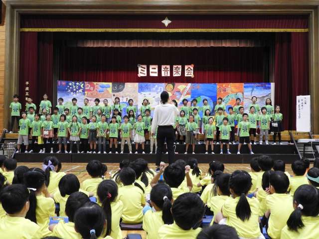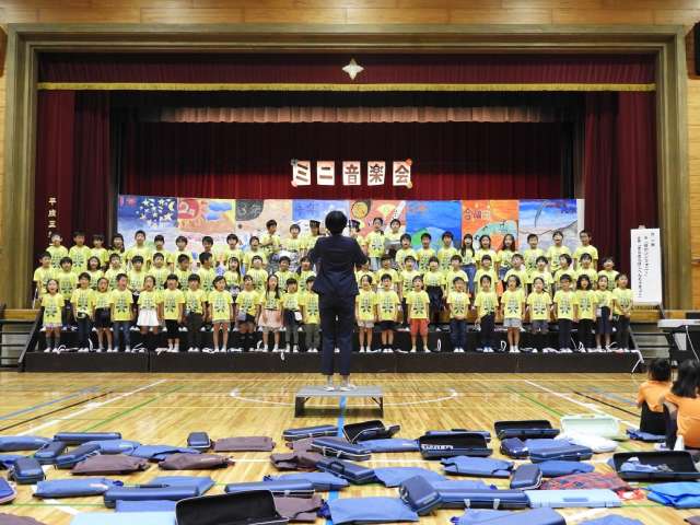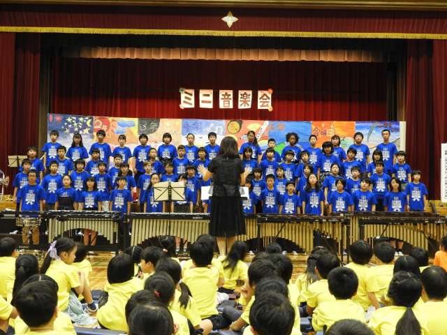 2018年9月29日、ミニ音楽会を行いました。今年は、創立90周年記念Tシャツを着用し、各学年とも音楽授業で練習してきた成果を発揮して歌と合奏を披露しました。いつもの雰囲気とは違う鮮やかな色のTシャツが舞台上を華やかに彩り、美しい音色を観客の皆様に届けることができました。