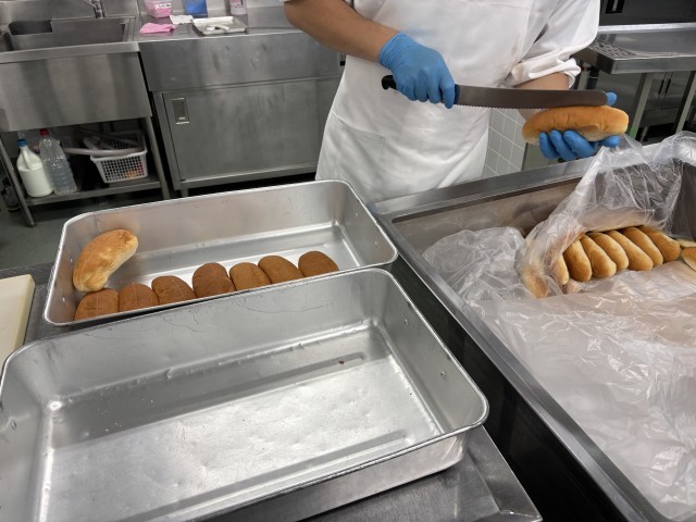 コッペパン一つ一つに切り込みを入れ、いちごジャムをたっぷりと挟みました。