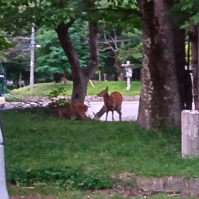 おはようございます。日光林間学園最後日の朝です。涼しくて、気持ちのよい朝です。野生のシカも家族でお散歩です。