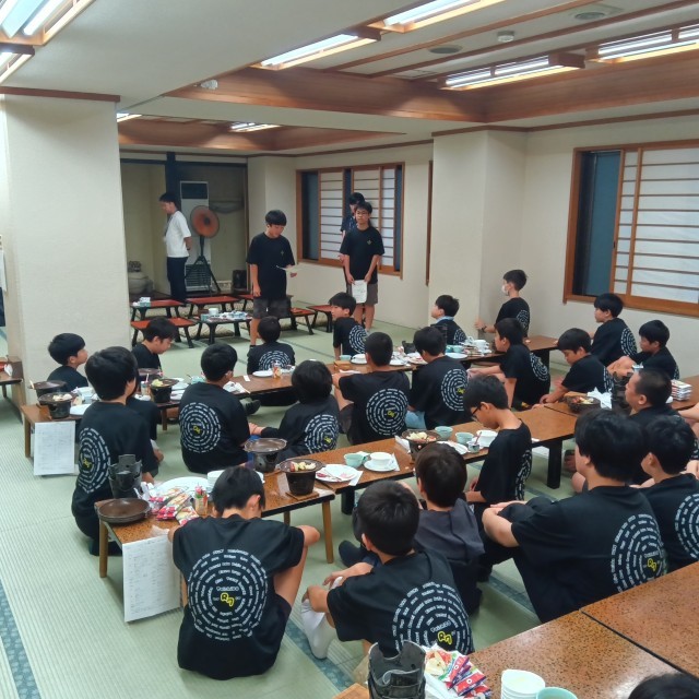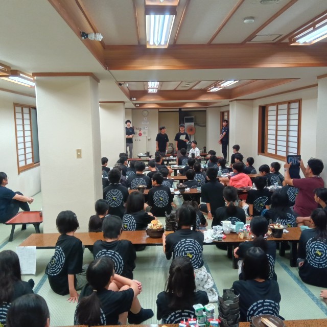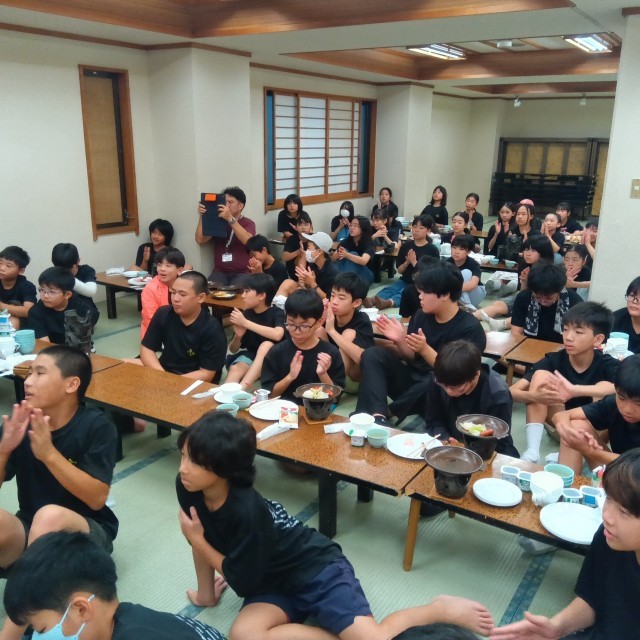 雨のため、朝食後に食堂で閉園式を行いました。3日間お世話になったホテル山月の方々に感謝の気持ちを伝えました。