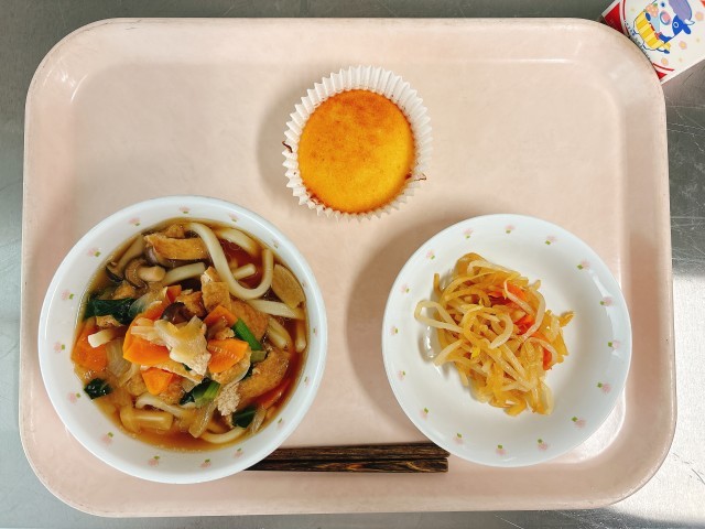 きつねうどんに使った油揚げは、味がよく染み込むようにしょうゆ、さとう、出汁で一度煮ています。