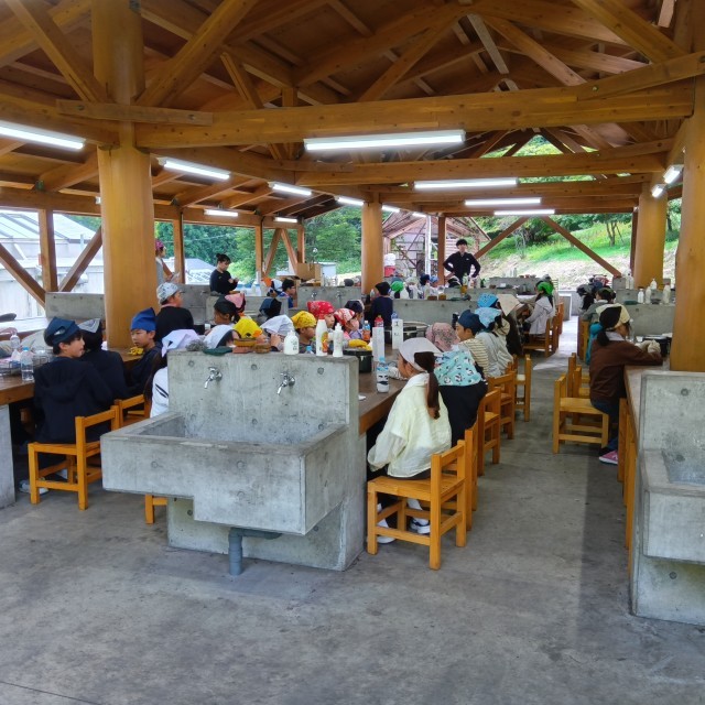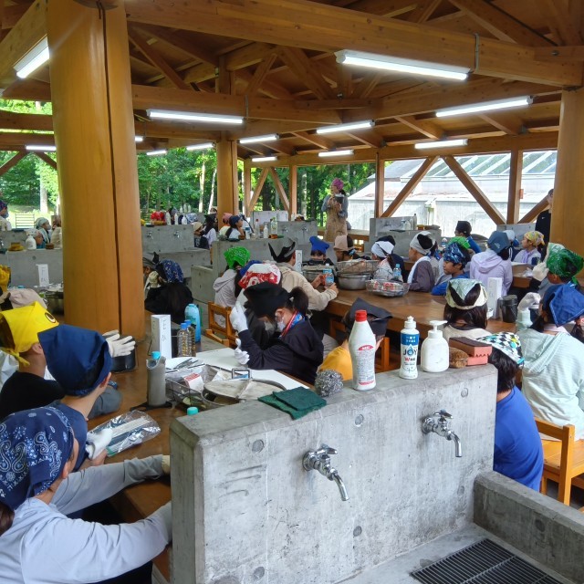 さあ、一日目の夕食、カレーライス作りが始まります。ただ今、作り方の説明を受けています。無事にでき上がるかな?