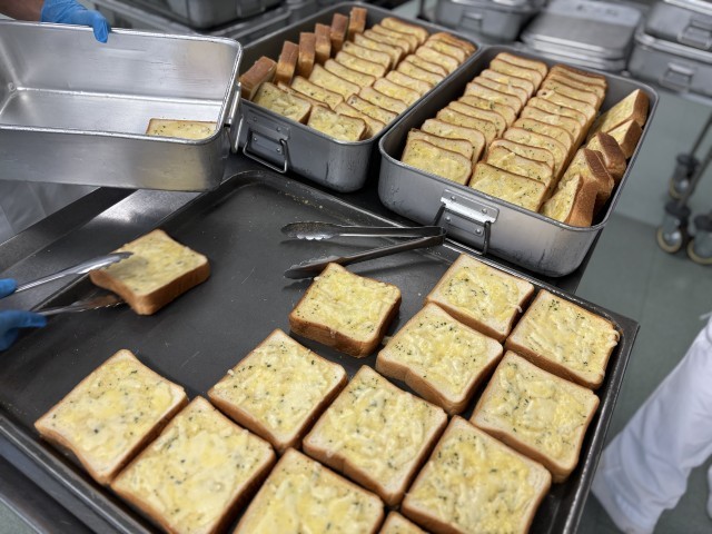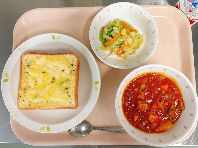給食でお馴染みのガーリックトーストに、チーズを乗せました。シチューにつけて食べても美味しいです。