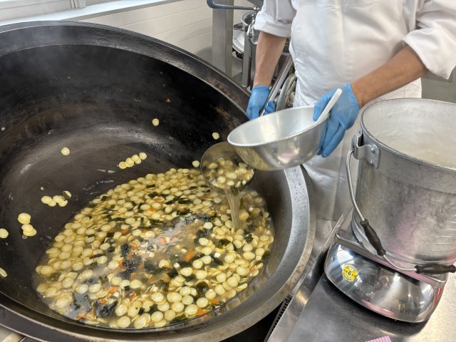 十五夜にちなんでスープには月見のかまぼこを、デザートにはみたらし団子を作りました。秋の訪れを感じますね。