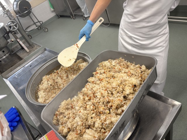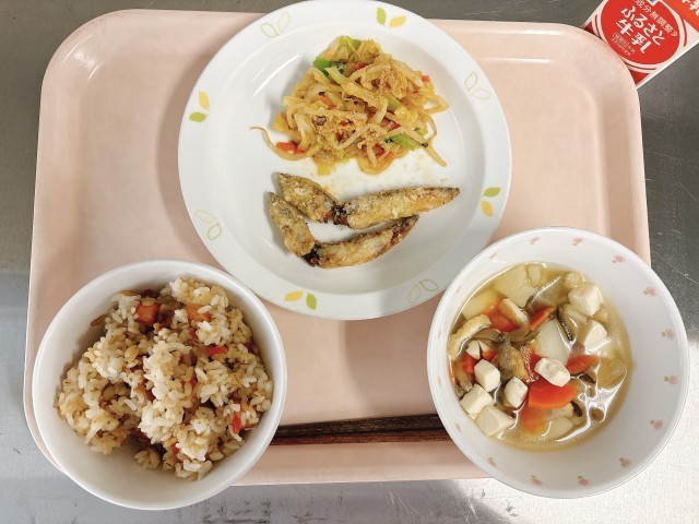 さつまいもやきのこなどの秋を感じる野菜をたくさん使った混ぜご飯を作りました。さつまいもはコロコロサイズにしてカリカリに揚げています。