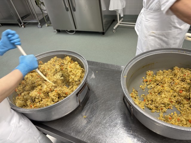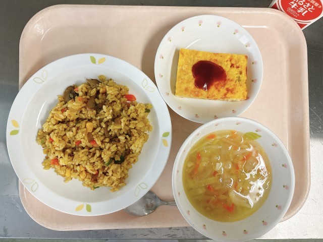 カレーピラフはお米にカレー粉も一緒に入れて炊き上げることで色と香りがしっかりつきます。