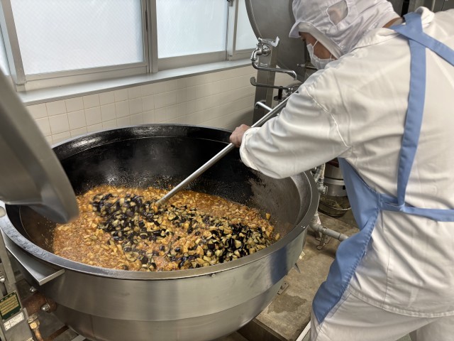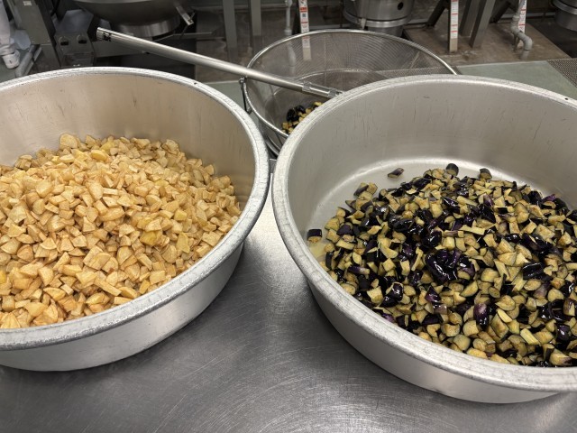 麻婆丼のナスとジャガイモは素揚げすることで、食感をよくする工夫をしています。ナスが苦手な子もチャレンジする様子がたくさん見られました。