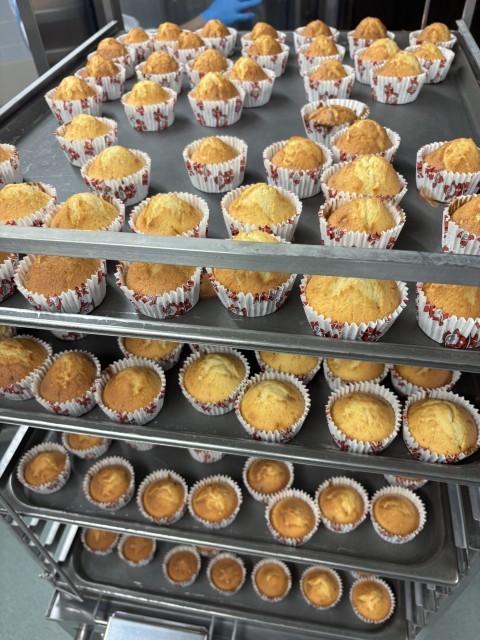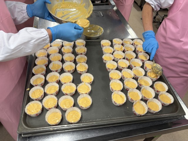 デザートには、サンタ柄のカップを使ったカップケーキを作りました。中はしっとり外はカリカリに、焼き上がりは雪のような粉糖をかけて仕上げています。