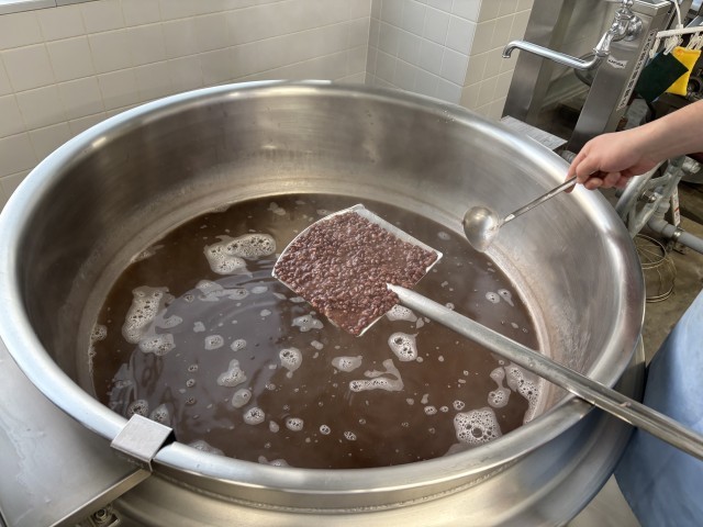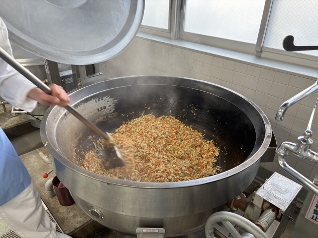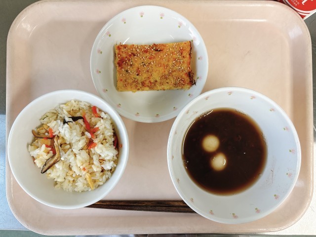 七草ごはんには、大根やかぶ、せりなどを使いました。白玉しるこは、朝からあすぎを丁寧に煮て作っています。3学期も、給食をたくさん食べて元気に過ごして欲しいです。