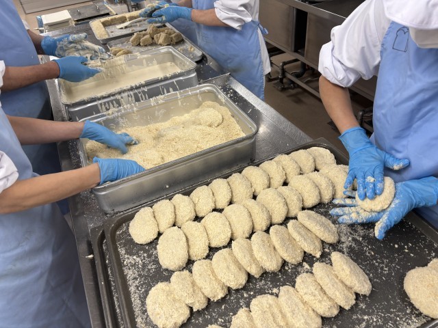コロッケは、蒸したじゃがいもをつぶしてひき肉などを入れて味付けし、衣をつけて揚げています。今日は約460個のコロッケを調理員さんが一つ一つ形を整えて作ってくれました。外側はカリカリ、内側はホクホクの手作りならではの美味しさを感じてもらえたらうれしいです。
