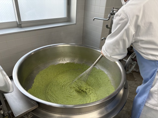 給食室では、茹でた枝豆をミキサーにかけてつぶし、砂糖と合わせてゆっくり煮て作りました。