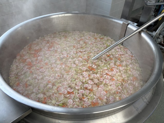 今日は節分にちなんで豆ごはんと節分汁を出しました。豆ごはんは、衣をつけて揚げた大豆に、青のりとしょうゆをベースとしたタレをからめてごはんと合わせました。節分汁には鬼の柄のかまぼこを入れ、行事の雰囲気を感じられるようにしました。